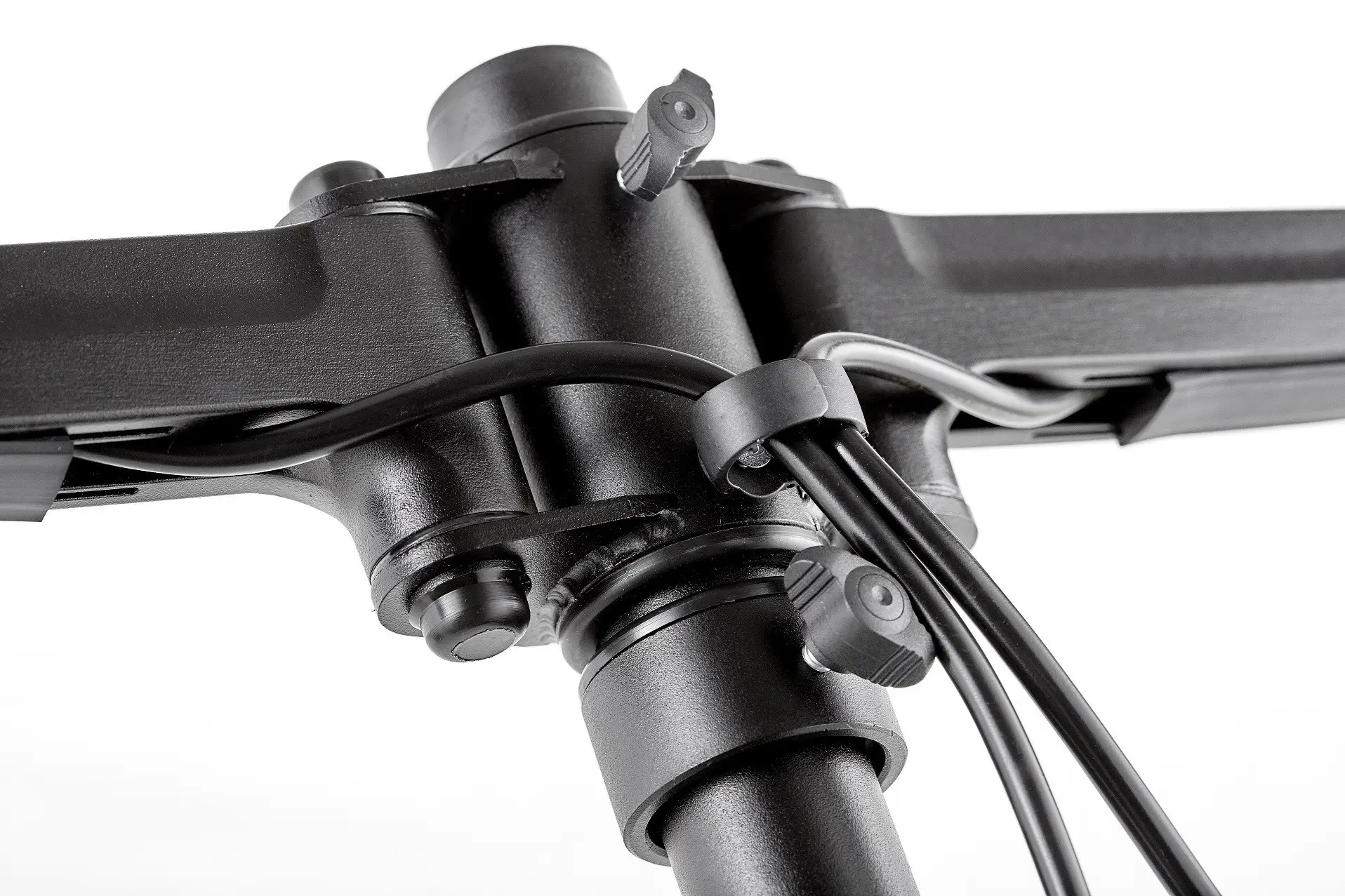 Die stabile Konstruktion trägt bis zu 20 kg Gesamtlast und bietet durch die zwei enthaltenen Befestigungsarten (Tischklemme und Durchschraubmontage) eine flexible Installation. Ein integriertes Kabelmanagement-System sorgt zusätzlich für Ordnung und ein professionelles Erscheinungsbild.