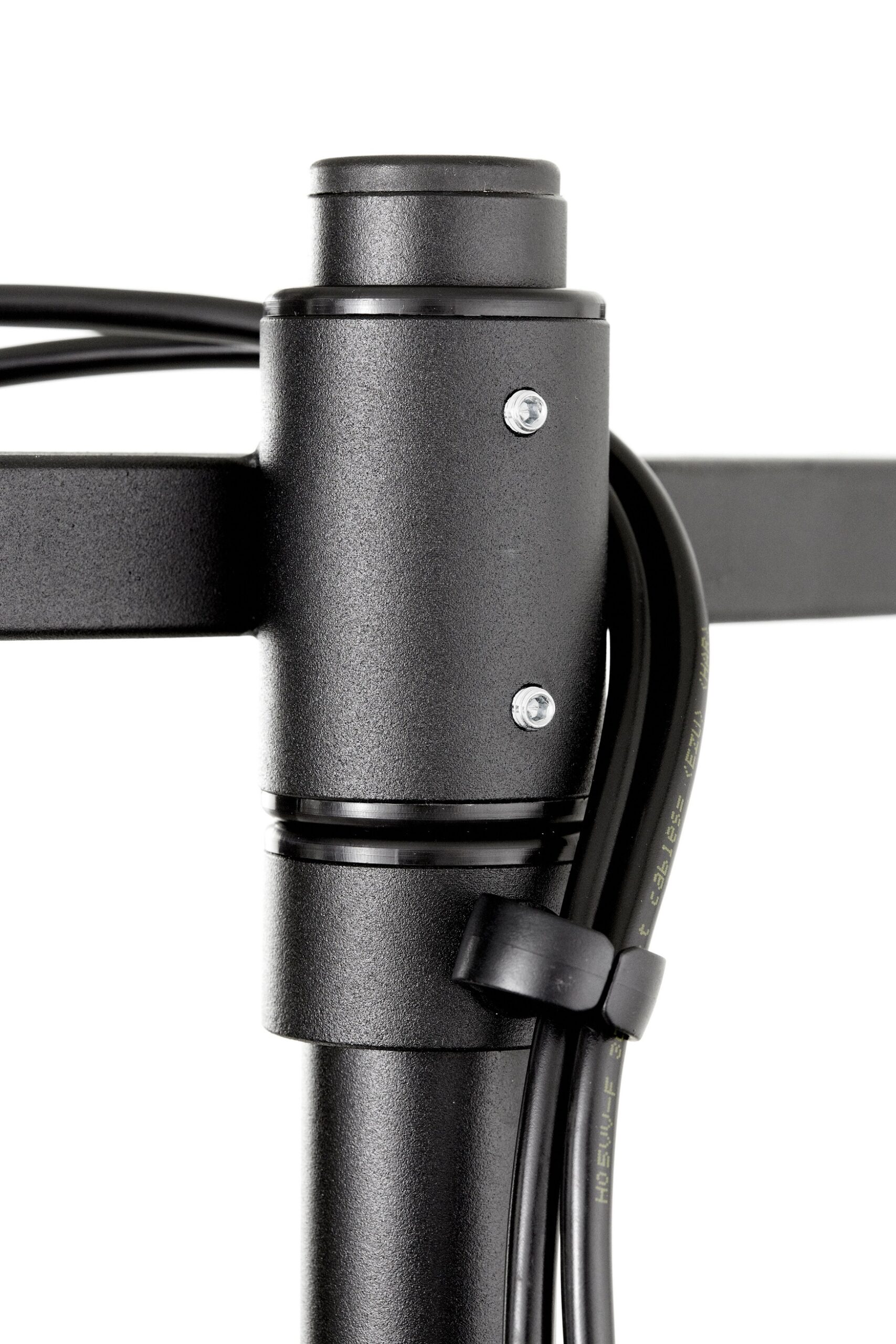 Zwei verschiedene Befestigungsoptionen (Klemmbefestigung oder Durchschraubmontage) ermöglichen eine flexible Installation. Durch das Kabelmanagement-System bleibt der Arbeitsplatz stets aufgeräumt und modern.